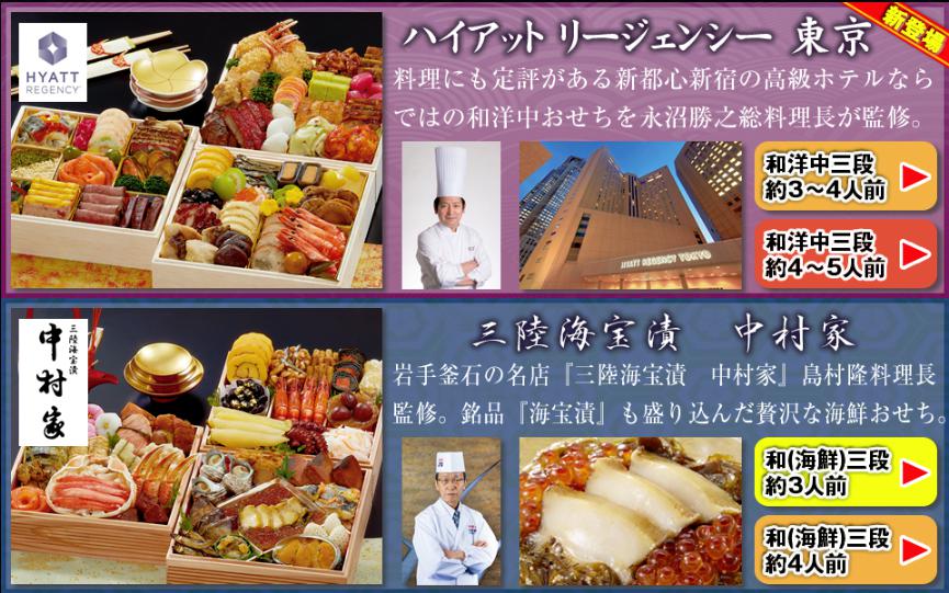 有名ホテル、料亭監修のおせちから自社ブランドのおせちまで お客様のニーズに合わせた個性的なおせちを取り揃えています。 1934年開業の北海道を代表するホテルのひとつで総料理長と各調理長が監修した和洋中おせちや、 洋風オードブルなどホテルならではのおせちをお楽しみいただける【札幌グランドホテル】、 「三陸海宝漬」でおなじみの釜石の名店で海宝漬やうに、 蟹など贅沢な海の幸をふんだんに使った海鮮おせちの【三陸中村家】、 東京赤坂の地で創業百有余年、濃厚な味わいの栗きんとんにもこだわった【赤坂三河家】。