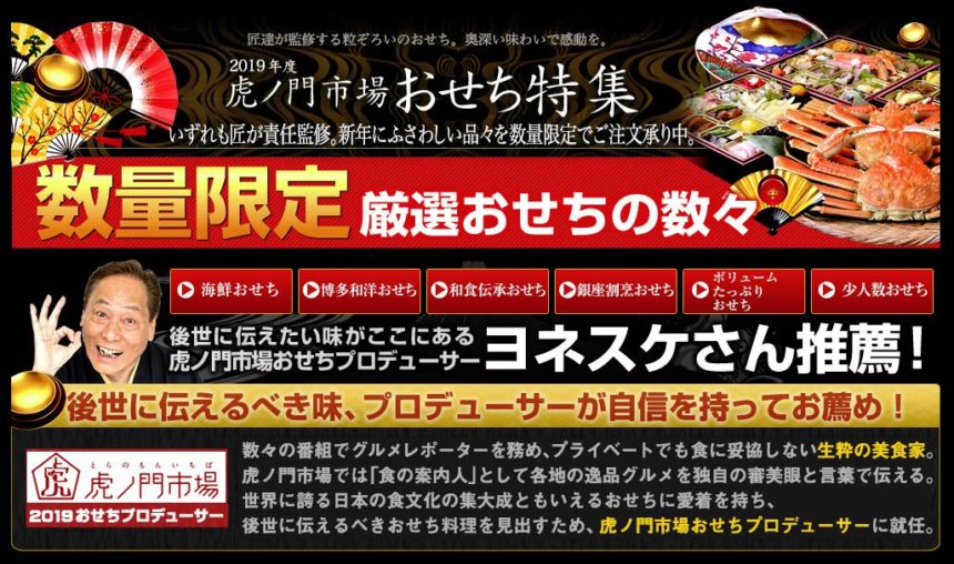 虎ノ門市場では「食の案内人」として各地の逸品グルメを独自の審美眼と言葉で伝えて頂きます。世界に誇る日本の食文化の集大成ともいえるおせちに愛着を持ち、後世に伝えるべきおせち料理を見出すため虎ノ門市場おせちプロデューサーヨネスケ氏のお薦めするおせちをご賞味ください。